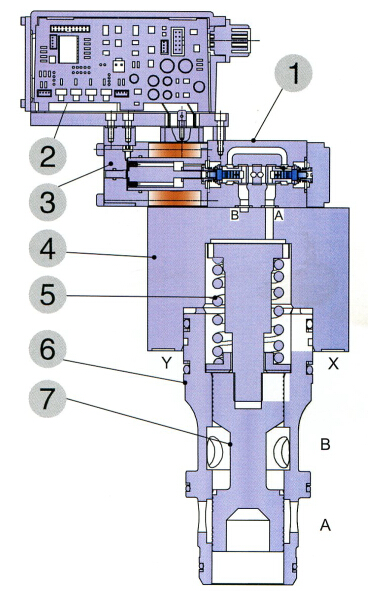 阀套 ⑥内作直线开闭运动。根据输入电信号的大小提供流量控制。此类阀与放大器协同工作,放大器向比例阀提